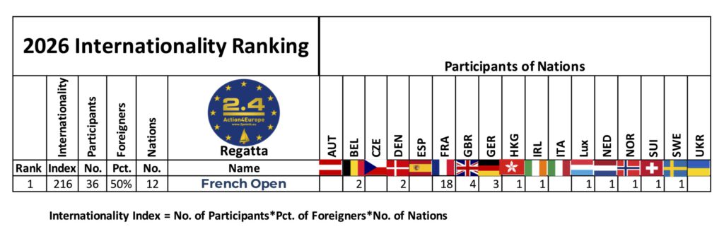 Auch hier ist das Ranking natürlich noch nicht sehr aussagekräftig. Es zeigt nur die French Open, die mit Teilnehmern aus 12 Nationen und 50 Prozent Ausländern, d.h. Nicht-Franzosen aber bereits sehr anspruchsvoll. Diese Regatta gilt es im weiteren Verlauf der Saison zu schlagen, was nicht einfach sein dürfte.